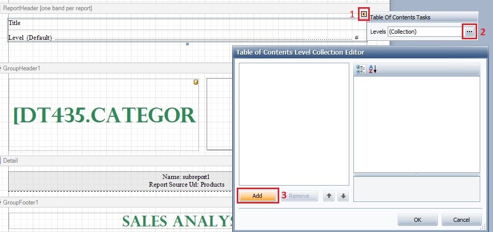 From the toolbox, drag and drop the tool Table of Contents in the Report Header.