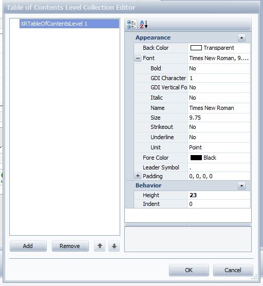 In the table of contents double click on Title to change the title of the table of contents, and in the property grid change the appearance of the Table.