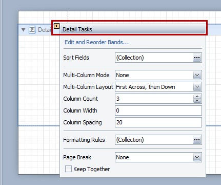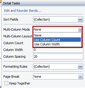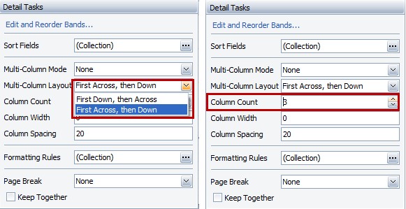 In the drop menu Multi-Column mode select Use Column Count, then in the menu Multi-Column Layout choose first across then down or vice versa, then choose the number of columns to appear in the report.