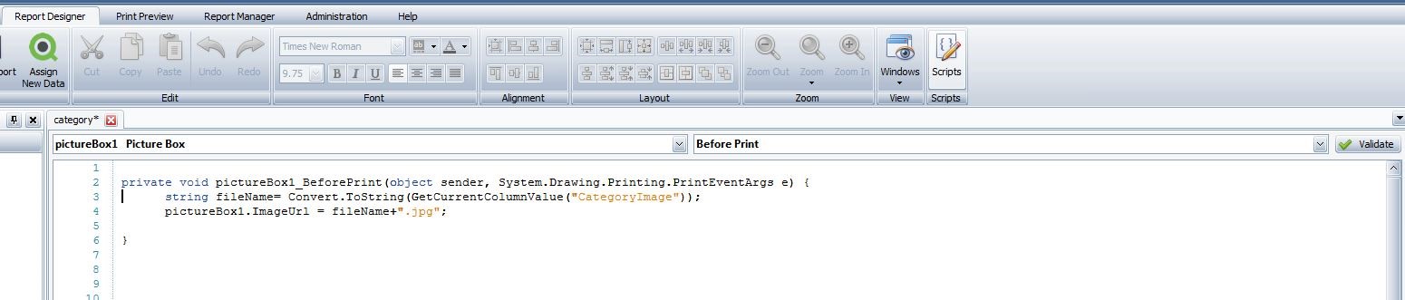 Solution: add a Picture Box to the report and while it is selected, open the Script Editor and select the BeforePrint event from the right dropdown menu.