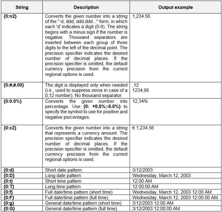 To create format patterns for date and time values, combine the strings listed in the tables below. These strings represent the year, month, day, number and so on, in different formats.