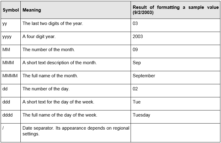 The following table lists the most frequently used strings that can be used to format dates.