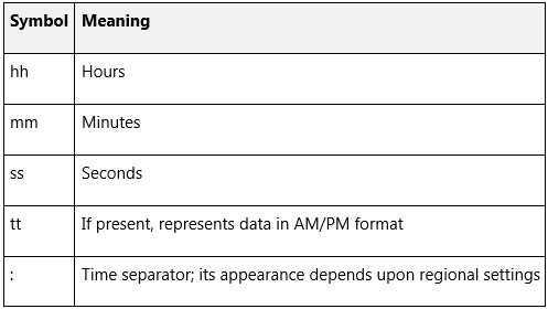 The next table lists strings that are used to format time values.